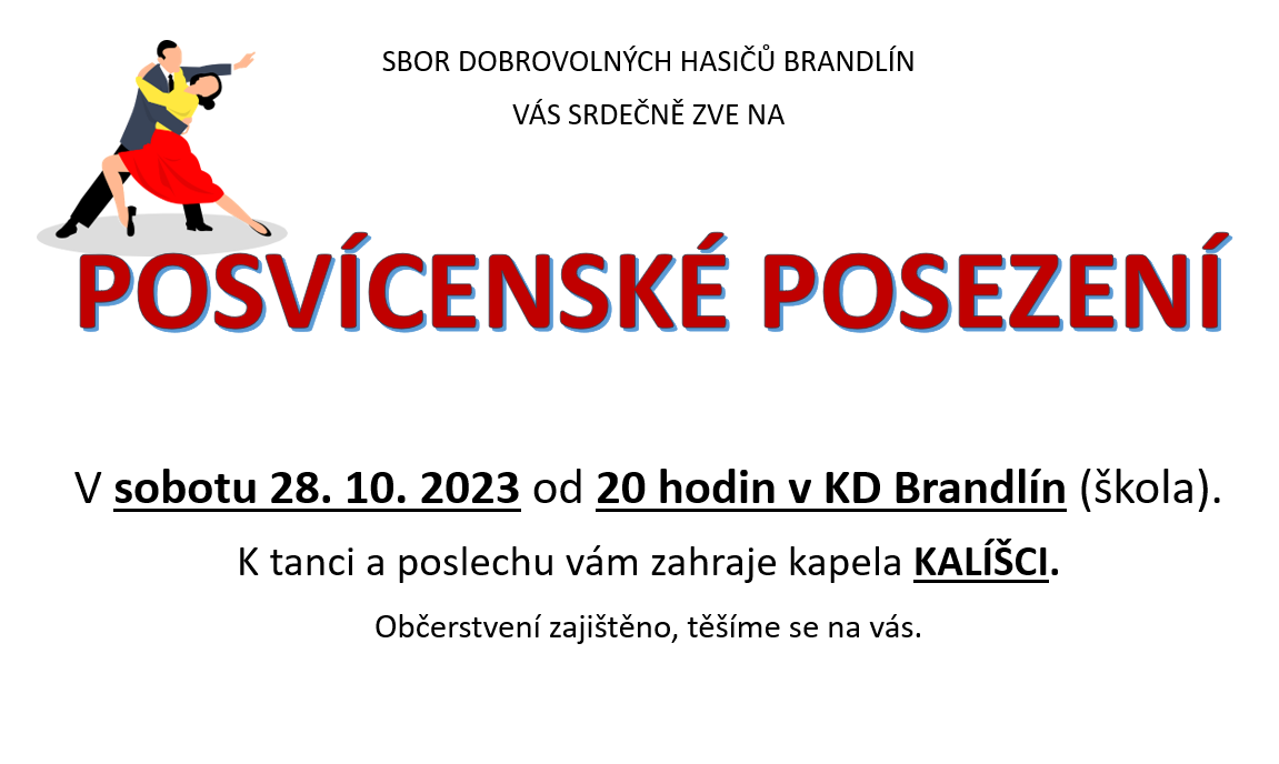 Vážení přátelé, srdečně vás zveme na tradiční posvícenské posezení v Brandlíně. Akce se bude konat v sobotu 28. října 2023 od 20 hodin v KD Brandlín. K tanci a poslechu vám zahraje kapela Kalíšci. Dorazte za námi užít si pohodový večer a pobavit se. Budeme se na vás těšit.