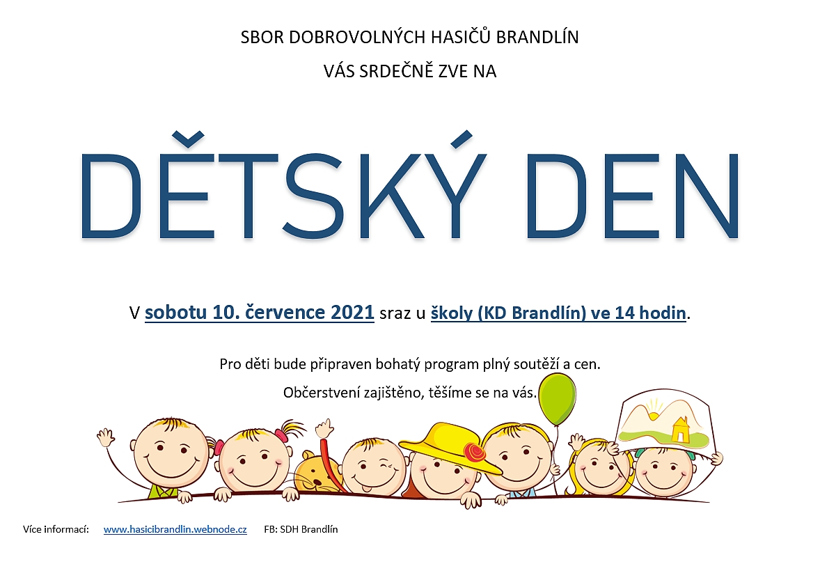 Zdravíme vás přátelé. Prožili jsme teď všichni dobu kdy se nemohlo nic moc konat a proto teď, když už je to jen trochu možné bychom vás rádi pozvali na dětský den. Akce se bude konat v sobotu dne 10. července 2021 a sraz bude ve 14 hodin u školy v Brandlíně (kulturní dům). Pro děti bude připravena stezka se soutěžemi v lese a další doprovodný program. Občerstvení bude zajištěno. A vám tedy nezbývá nic jiného než sebou vzít vaše děti a hlavně dobrou náladu. Moc se na vás po tak dlouhé době těšíme.
